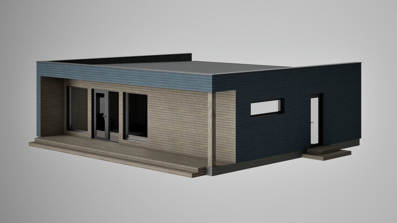 Prefabricated wooden timber frame flat-roof single-storey modern family home with 2 bedrooms, 1 WC and a terrace.